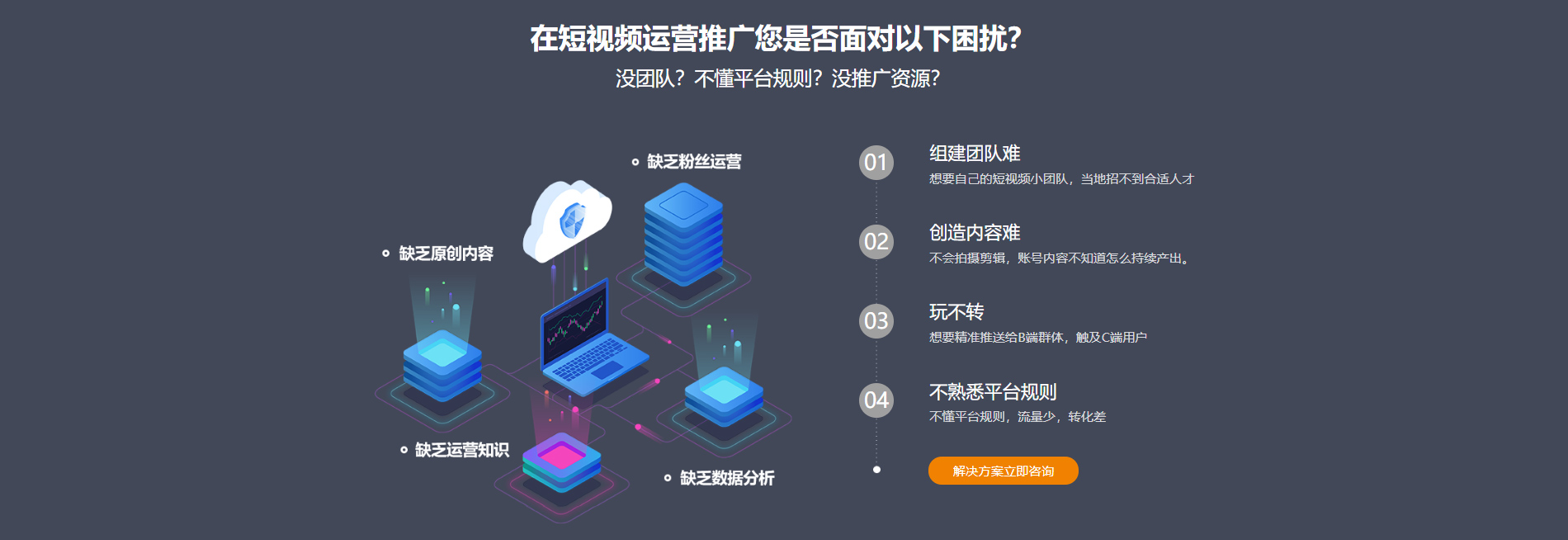3. 一站式托管 定位,內(nèi)容策劃,腳本撰寫,拍攝剪輯,提供一條龍的短視頻代運營推廣服務(wù)。